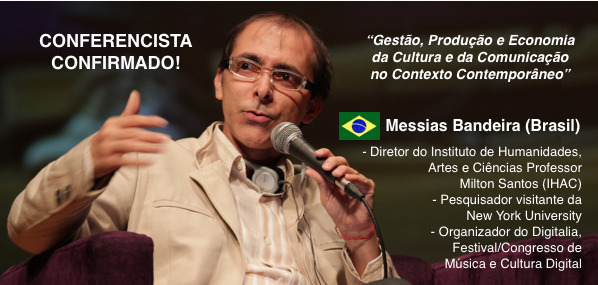 Mais um conferencista confirmado no I Simpósio Internacional de Gestão da Comunicação, Cultura e Turismo (SINCULT 2015). Prof. Dr. Messias Bandeira é músico e produtor cultural, organizador do Digitalia – Festival/Congresso de Música e Cultura Digital. Diretor do Instituto de Humanidades, Artes e Ciências Professor Milton Santos (IHAC). Pesquisador visitante da New York University.